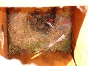And so this afternoon, when the rain showers had stopped and the sun had come out, I went back into the garden to investigate the fallen birdbox from this morning. Immediately, I was aware of a very bad smell and it was obvious that something was not right. I gently prised the roof off the box and inside was a perfectly crafted nest. In the nest, were four or five dead chicks. Despite the smell, they were still in good condition and hadn’t completely decomposed. So I reckon they’d been alive a good few days previously.