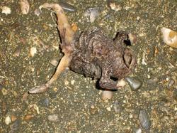 Yesterday, on our front path leading to the front door, a badly decomposed frog had been deposited. Who had dropped this croaked croaker is still a mystery. The general consensus of opinion believes that a bird, possibly a crow, may be the culprit. Here’s a gory picture: