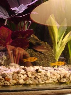 And here’s a badly taken photograph of my fishtank – the yellow fishes are mollys and the brown blur in the centre of the pic is a catfish: